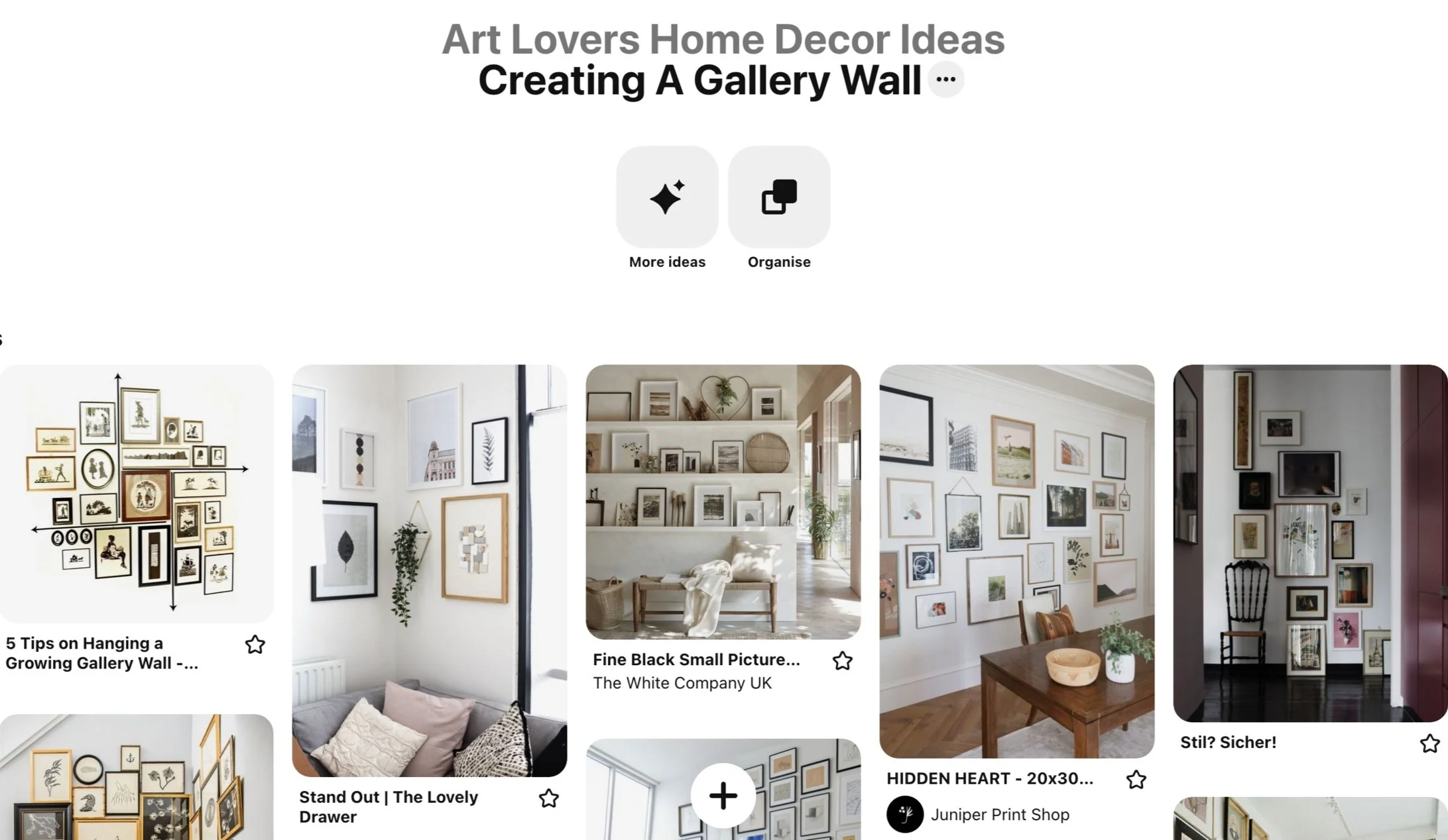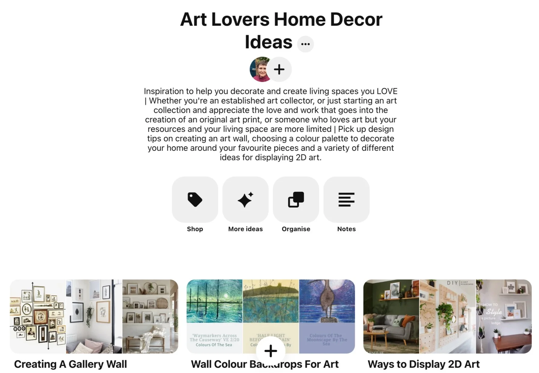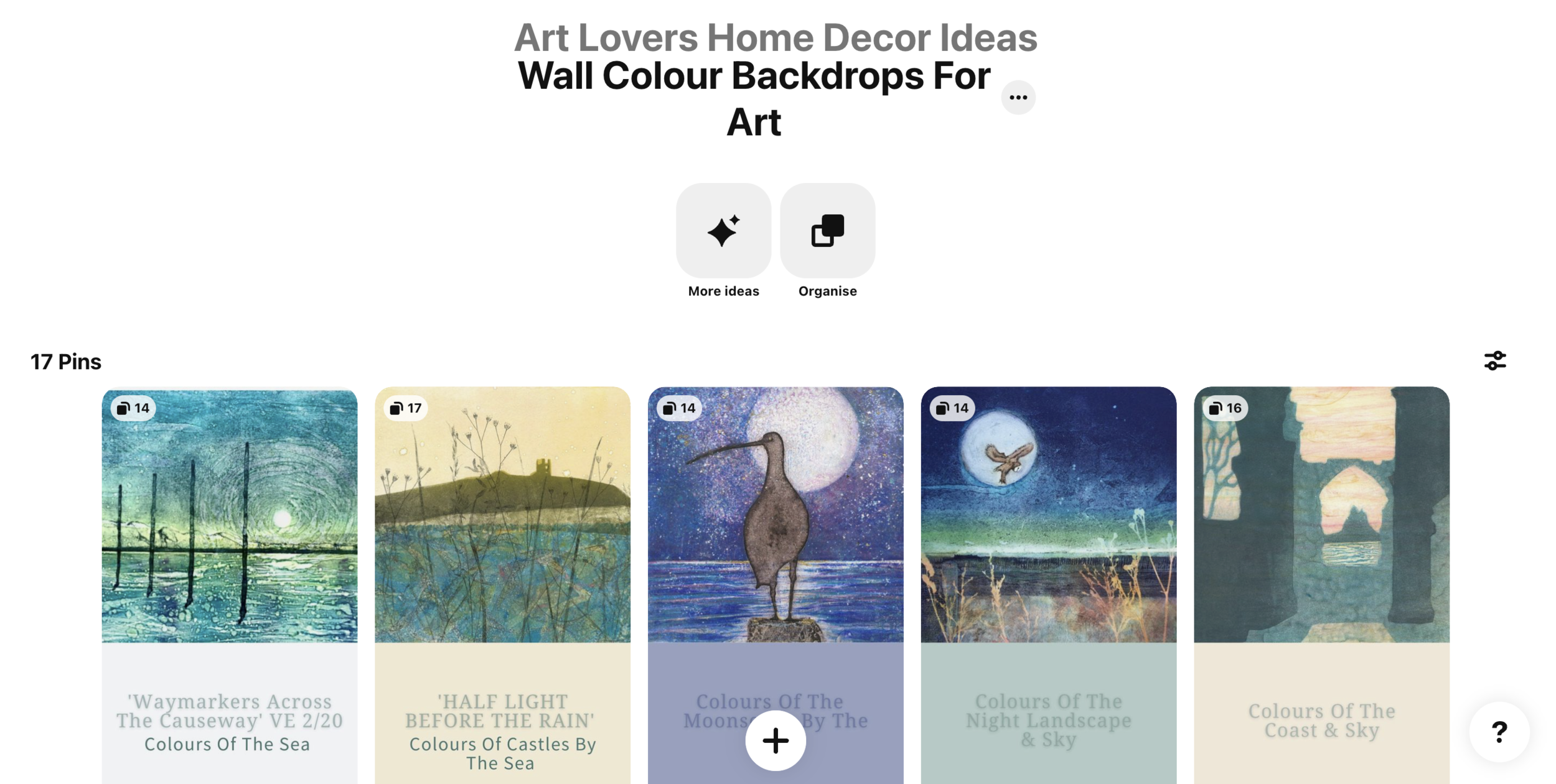 Some of the pins, that are not my work, are there to show how you can pick a colour theme, or subject, with complimentary colours that can be pulled together for a gallery wall and in the furniture, shapes in the art work that can be picked up on in the accessories and so on.
