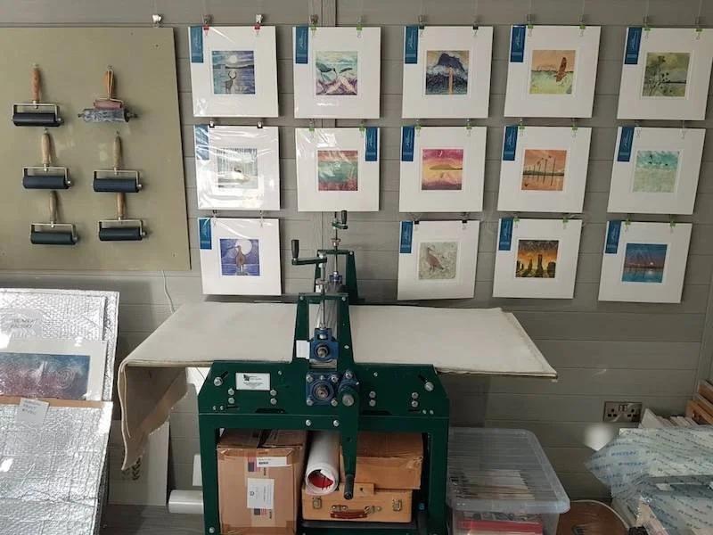 My garden studio is available for hire for independent printmaking sessions. Whether you are a local artist without access to a printmaking press, or a visiting printmaker who wants to keep working during your stay, or a former workshop participant who wants to build on what you’ve learned, you’re welcome to come in and use the space.